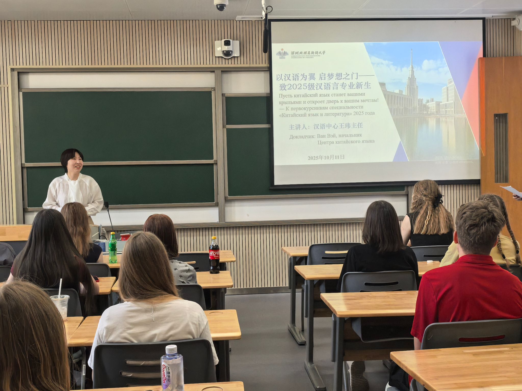 为帮助国际新生们全面了解专业特色,树立学习目标,快速融入中国的大学生活,10月11日,深圳北理莫斯科大学汉语中心举行了2025级汉语言专业新生见面会。中心主任王玮、全体专职教师、教辅人员以及汉语言专业2025级全体新生出席活动。见面会由教学秘书王馨悦老师主持。