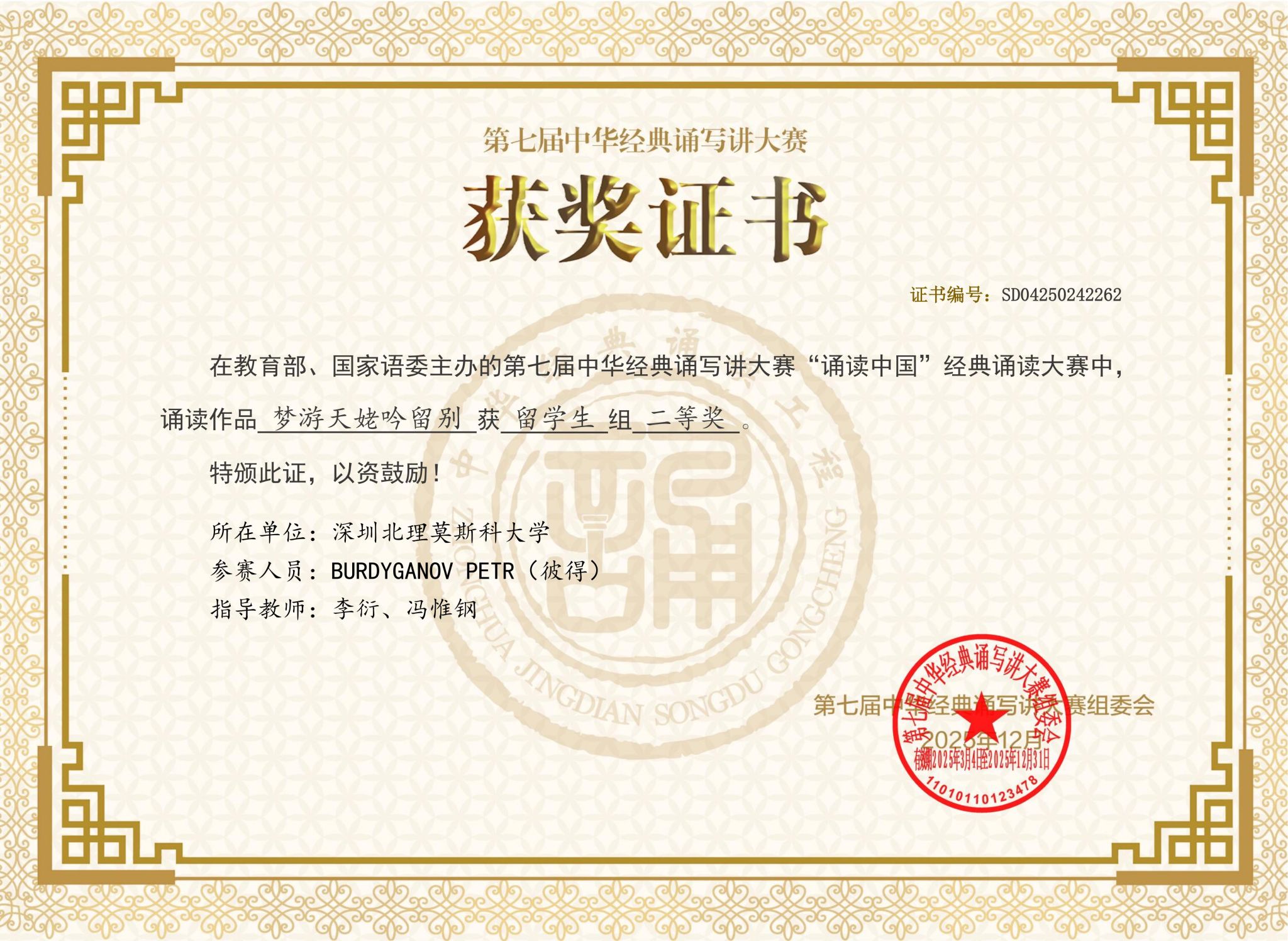 近日,深圳北理莫斯科大学汉语中心2023级汉语言专业学生BURDYGANOV PETR(彼得)凭借独诵作品《梦游天姥吟留别》斩获第七届中华经典诵写讲大赛之“诵读中国”经典诵读大赛国家决赛留学生组二等奖。这是学校国际学生连续三年参与该大赛以来取得的最佳成绩,充分体现了深北莫国际中文教育水平的稳步提升。