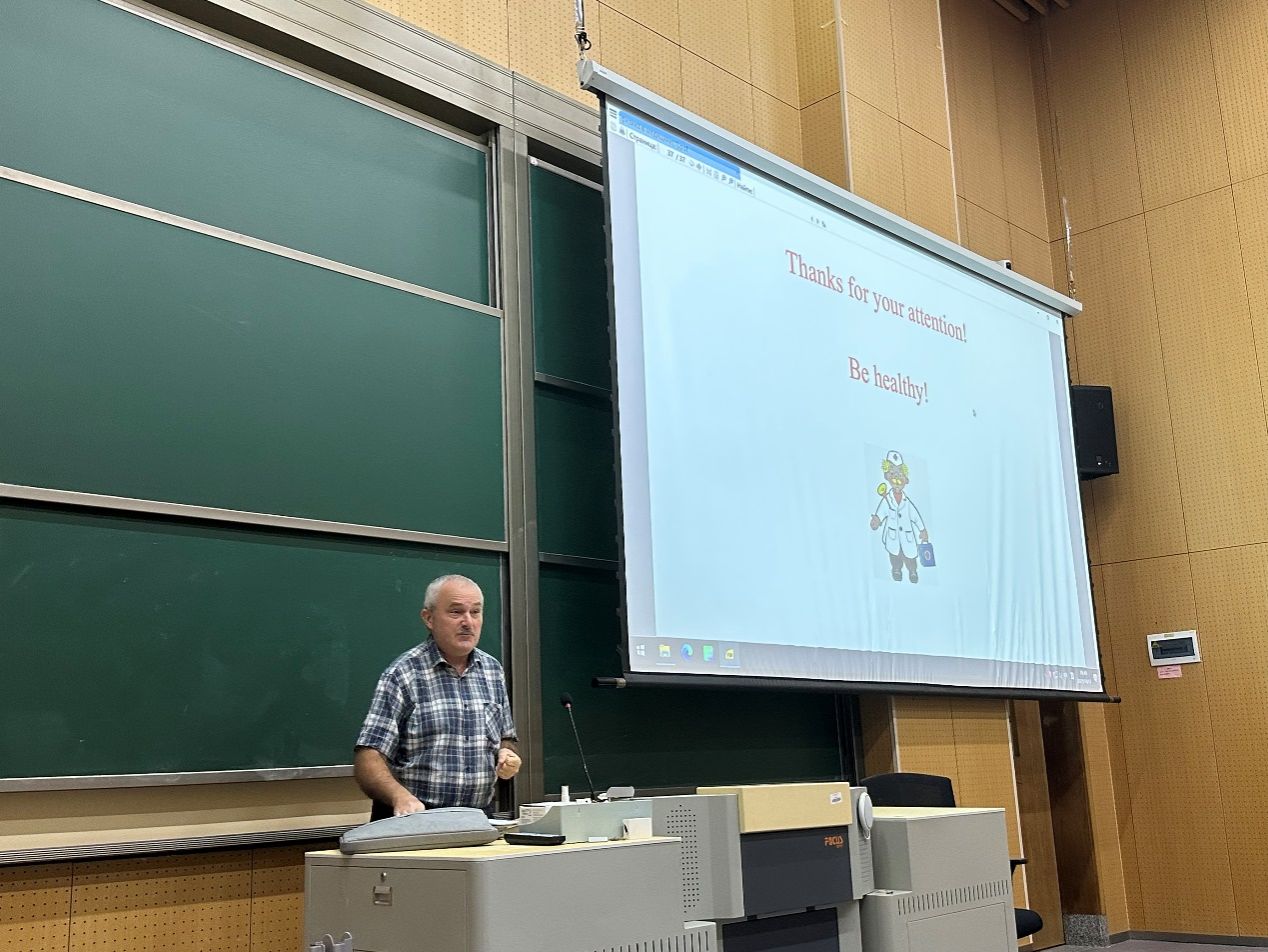 尤·安·科克沙罗夫教授主讲的三场俄语讲座,生动呈现了“物理+生命科学”的跨学科融合魅力。在《物理学与医学》主题讲座中,科克沙罗夫教授从物理原理解析医学成像、生物力学的底层逻辑,让“物理是医学的隐形骨架”这一观点具象化, 宏观地勾勒了物理学与医学这两个学科从古至今的紧密联系。他从经典的力学、光学在医学诊断中的应用,讲到近代的X射线、核磁共振成像(MRI)等革命性技术,阐述了物理原理如何成为医生“看清”人体内部、实现精准治疗的基础。让同学们理解了现代医学的每一次飞跃,背后往往都有物理学的强大支撑。