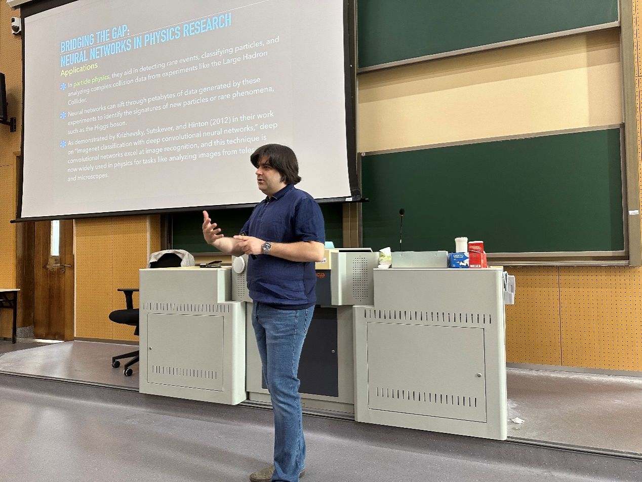 奥·伊·波波夫教授以英语讲授的《现代物理学中的神经网络》则带同学们走进“物理+人工智能”的前沿阵地——当神经网络成为解析复杂物理模型的工具,学科边界再次被打破。在讲座中,同学们了解到人工智能技术如何助力物理学家处理复杂数据、优化实验设计、甚至探索新的物理规律。这一方向充分体现了“智能+物理”的融合趋势,为未来科研开辟了新路径。