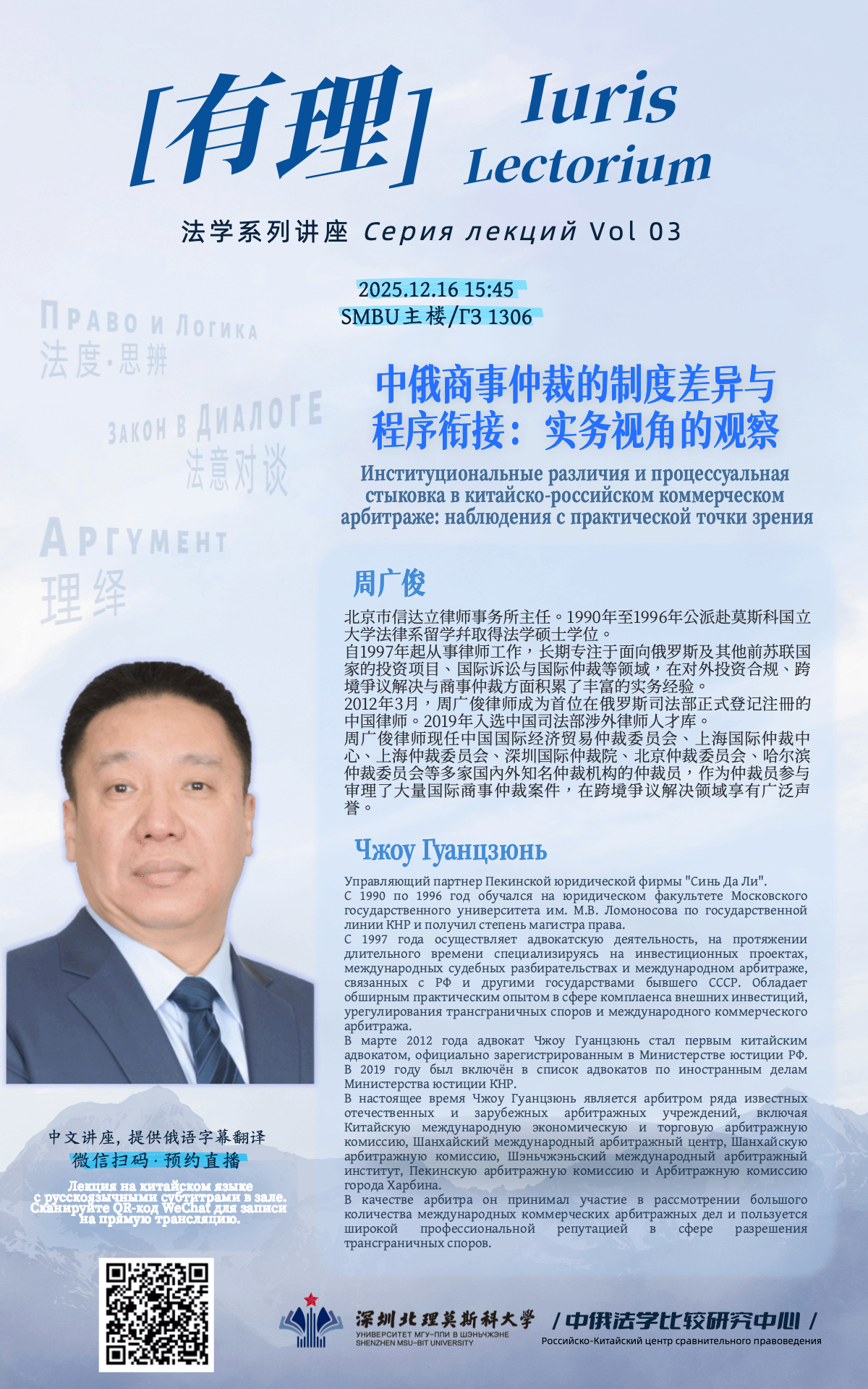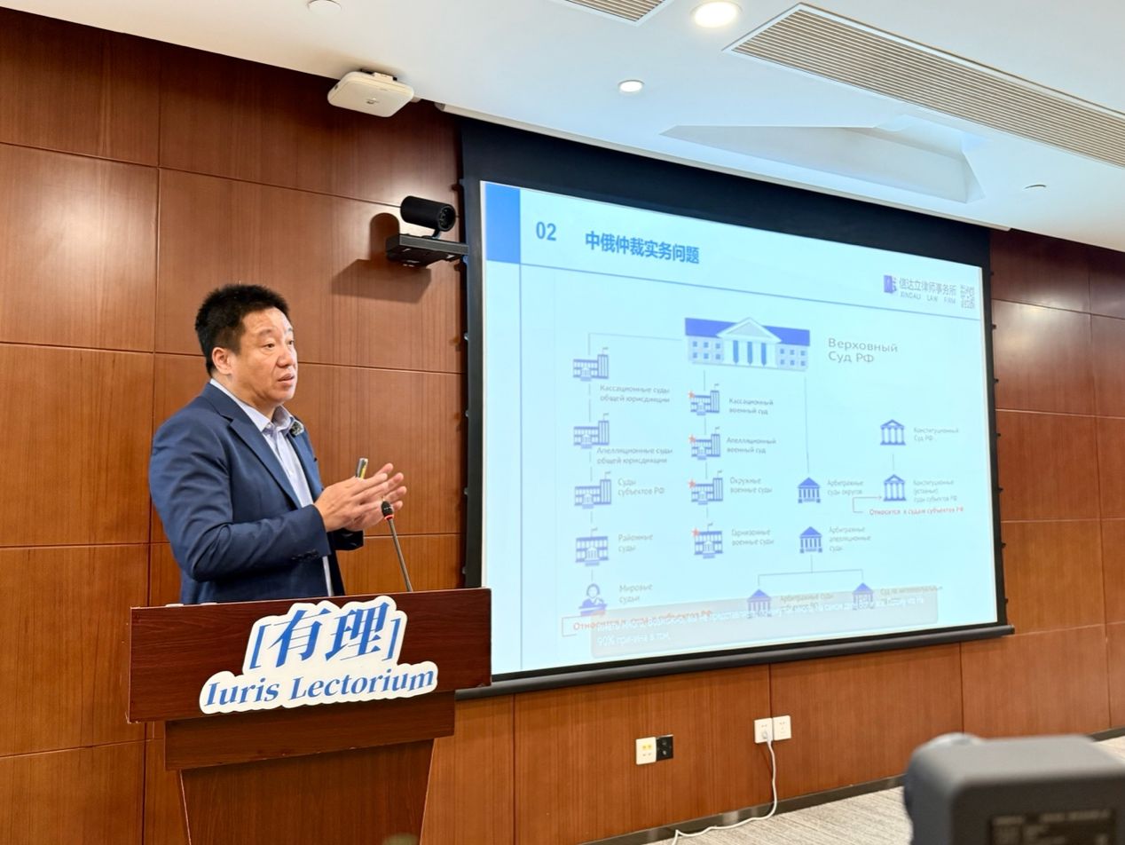 12月16日,深圳北理莫斯科大学第三期“有理 Iuris Lectorium”法学系列讲座在学校主楼1303报告厅举行。本次讲座由深圳北理莫斯科大学中俄法学比较研究中心主办,邀请了北京市信达立律师事务所主任、长期从事对俄及独联体相关涉外业务的周广俊律师,作题为《中俄商事仲裁的制度差异与程序衔接:实务视角的观察》的专题讲座。讲座采用中文主讲,并提供俄语字幕翻译,吸引了校内中外师生及深圳法律实务界人士现场参与。同时,讲座通过线上同步直播,吸引了众多学术与实务界同仁的关注。