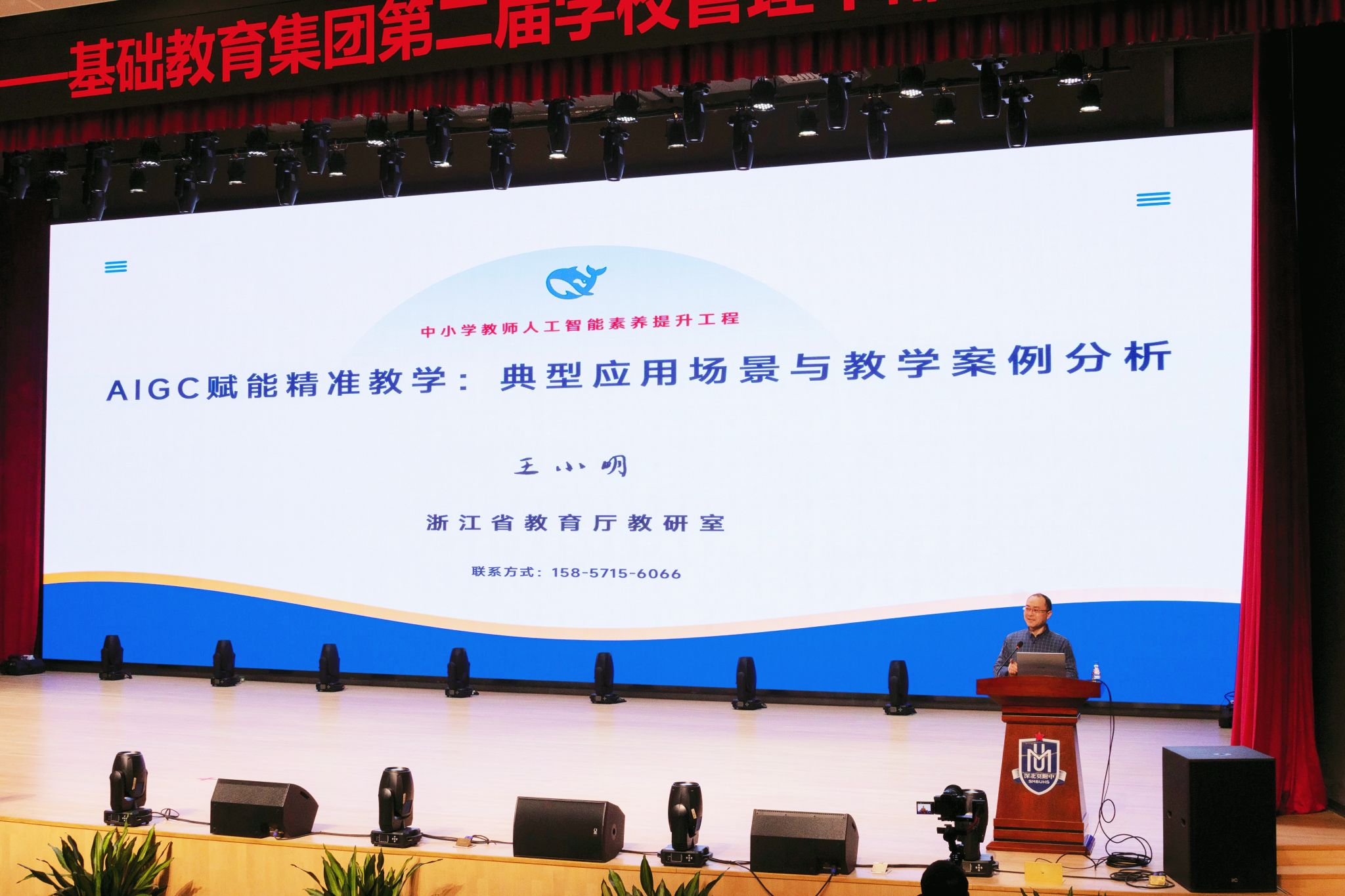浙江省教育厅教研室教研员王小明以《AIGC赋能精准教学:典型应用场景与教学案例分析》为题,从生成式人工智能协同精准备课、人机对话、作业设计、精准命题、数据分析等五大方面发表专题报告。