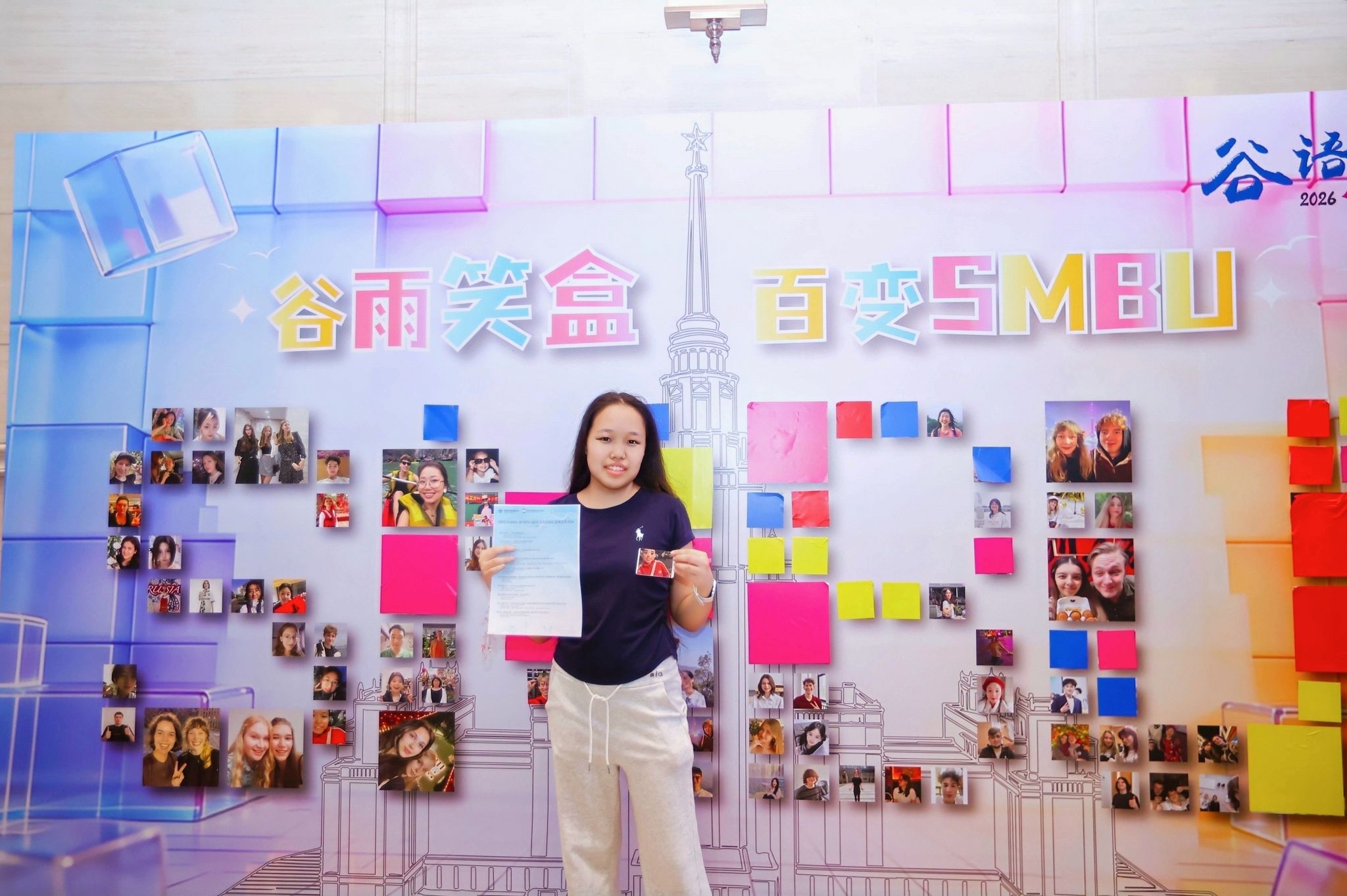 “谷语秀”才艺晚会是学校庆祝2026国际中文日的主体活动。除此之外,学校还举办了“谷雨笑盒·百变SMBU”“谷雨密语·汉字寻宝”“谷雨雅集”三项文化共创体验活动,吸引百余名中外学生积极参与。同学们上传微笑自拍,或遍寻校园各处,集字解密,让整个校园成为沉浸式文化体验空间。在“谷雨雅集”现场,参与前期共创活动的同学现场领取专属纪念礼品,并共同揭开SMBU笑脸墙的神秘面纱。现场还设置了丰富的文化体验摊位:同学们身着华夏衣裳,亲手制作干花书签,体验雕版拓印,并绘制俄罗斯套娃和中国京剧脸谱,共同体验东方韵味与俄式风情。
