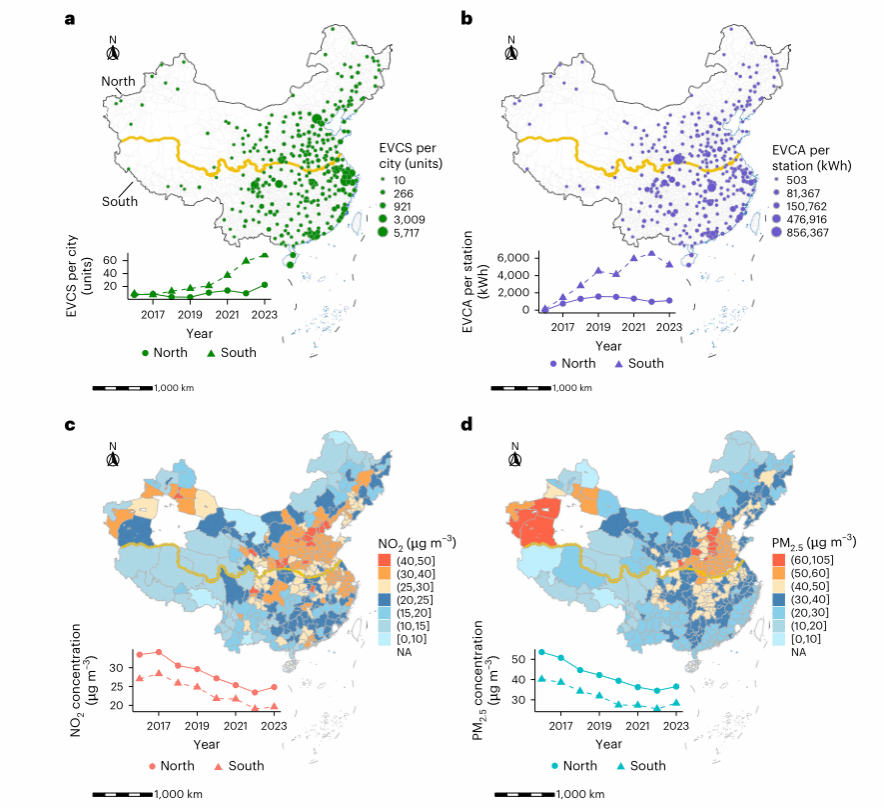 研究团队利用2016至2023年间中国292个城市、超过350万辆电动汽车的详细充电记录,结合空气质量与气象数据,采用工具变量法,首次建立了电动汽车实际使用与空气质量改善的因果关系(图1展示了各城市充电站点分布、平均充电量及NO₂、PM2.5浓度均值展现了空间分布异质性)。