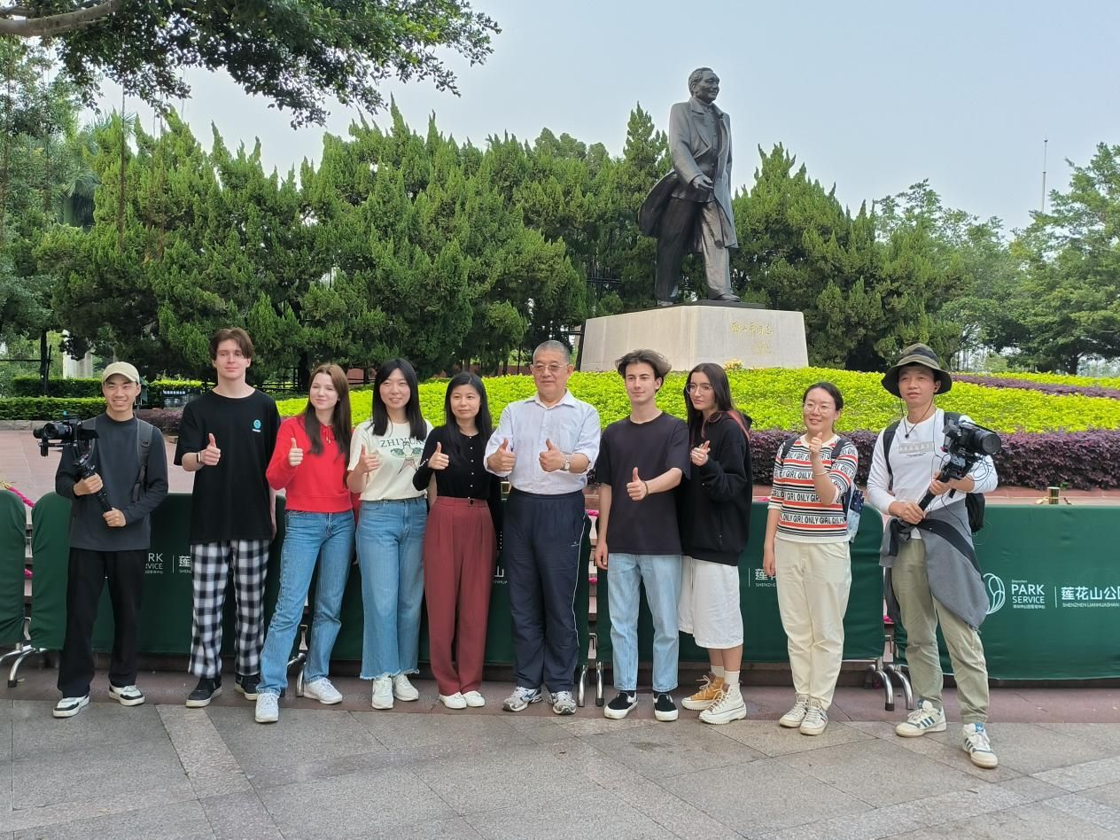 蒋梦晗与留学生一起拍摄“云游深圳”视频(左五)