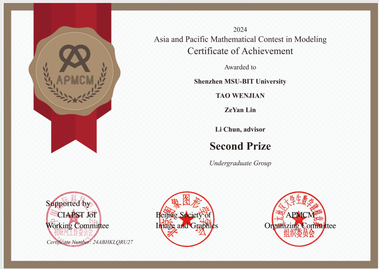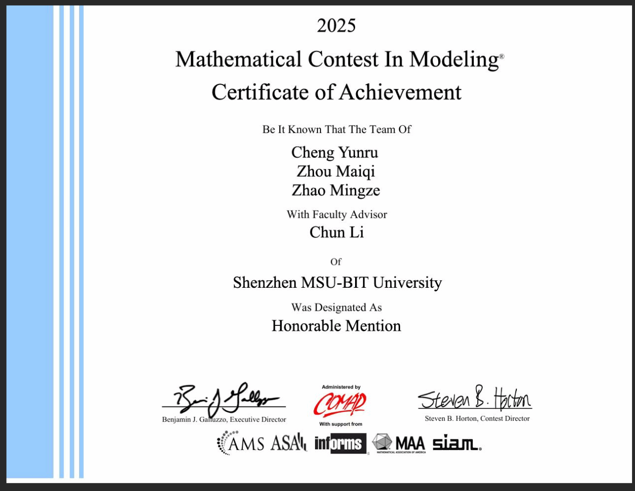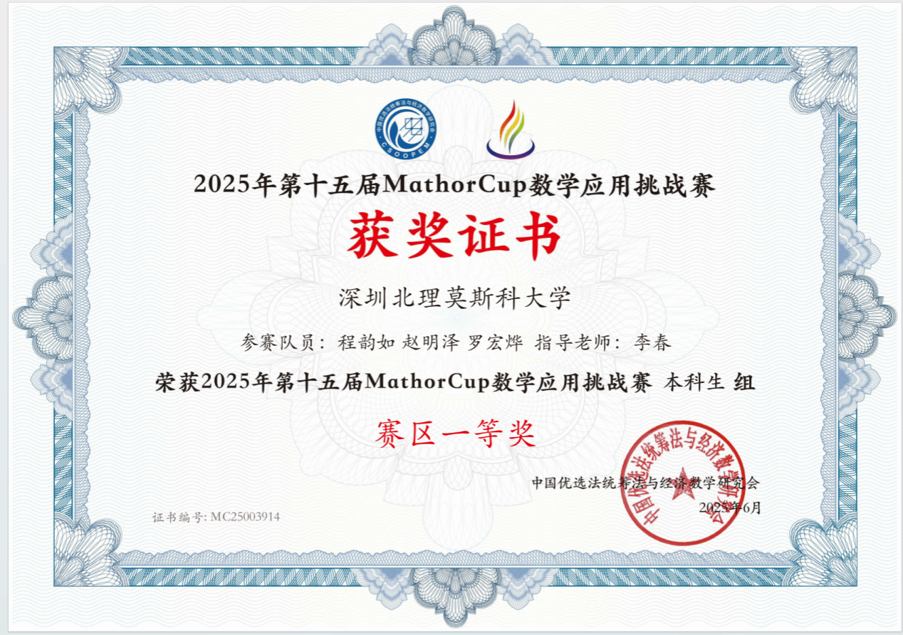 在人才培养方面,李春搭建了“导师—助教—朋辈”三级协同机制,通过建模训练营、论文共读与开源复现等方式,系统提升学生的创新实践能力。近三年来,他指导的学生在美国大学生数学建模竞赛中荣获4项H奖,在全国大学生数学建模竞赛中获得省级一等奖1项、三等奖2项,在亚太地区大学生数学建模竞赛中取得二等奖1项,在“挑战杯”广东大学生课外学术科技作品竞赛中获得三等奖。