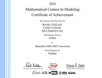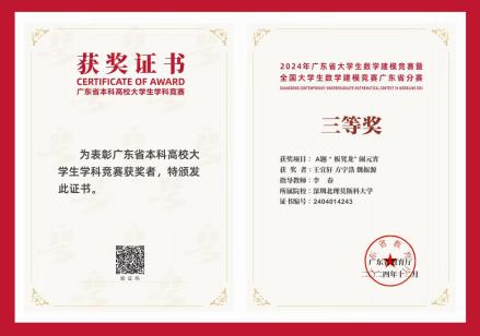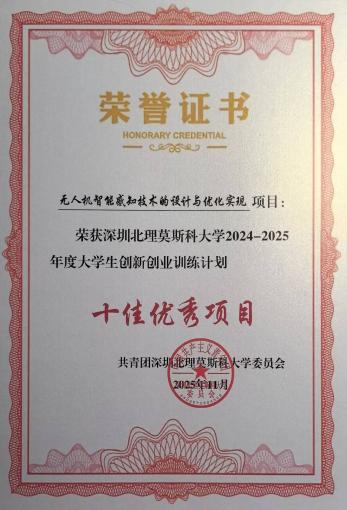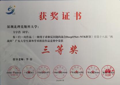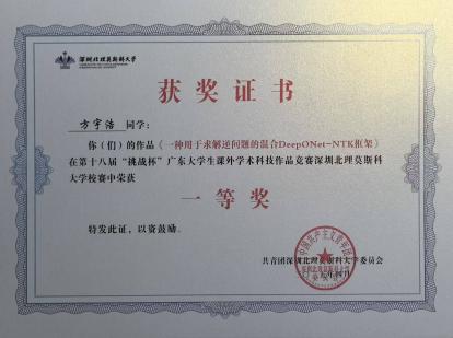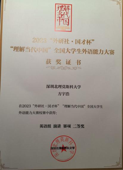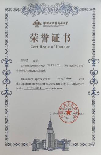 这份坚毅换来了方宇浩3.96的高绩点,稳居年级之首;他先后斩获2025深圳北理莫斯科大学“年度人物”、优秀学生标兵、科技创新先进个人等多项荣誉。他不仅专注课内学业,更主动拓展学科能力:在外研社・国才杯英语演讲比赛校赛中荣获二等奖,用流畅表达展现语言素养;在数学建模领域持续突破,接连斩获美国大学生数学建模竞赛F奖、全国大学生数学建模竞赛省级三等奖;获得“挑战杯”广东大学生课外学术科技作品竞赛省三等奖,在2024-2025学年大学生创新创业训练计划项目中主持一项国家级项目,并以工程系全系第一的成绩顺利结项,用严谨逻辑铺就学科竞赛的进阶之路。