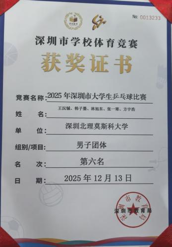 在专注学业与科研的同时,方宇浩从未停下全面发展的脚步。乒乓球台便是他释放活力、磨砺意志的舞台。2024年,他随队斩获深圳市大中小学生乒乓球比赛团体第七名;2025年,斩获团体第六名。正是在这种“有劳有逸、动静有常”的节奏中,锤炼了他高效的时间管理能力和坚韧的品格。