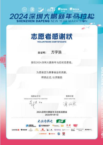 此外,方宇浩积极投身志愿服务。他曾作为志愿者参与深圳市大鹏新年马拉松等大型活动,在志愿服务中,他转换角色,从知识的汲取者变为责任的践行者,用脚步和汗水践行青年担当。