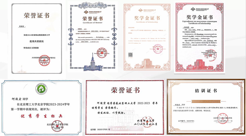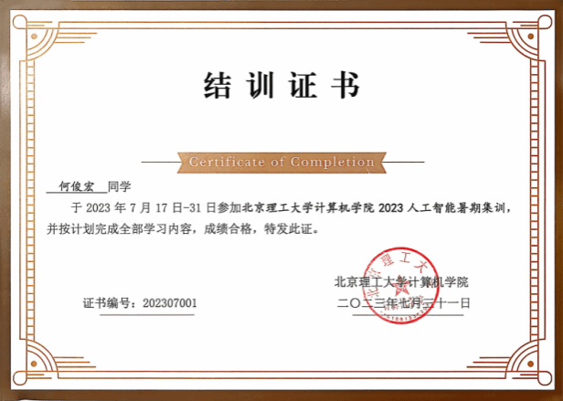 此外,他参加北京理工大学暑期人工智能集训,在实战演练中,将课堂所学理论知识灵活转化为实践能力,面对复杂项目任务时坚持钻研、积极探索,不断提升技能,展现出扎实的专业基础与良好的团队协作能力。