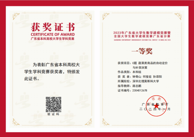 这份专注与努力,让他交出了3.92的优异绩点,连续四次获得校级一等学业奖学金,并荣获优秀学生标兵、科技创新先进个人等荣誉称号。同时,他积极参与各类学科竞赛,先后斩获全国大学生数学建模竞赛省级一等奖及美国大学生数学建模竞赛H奖,锤炼了分析解决实际问题的能力、团队协作意识与创新思维,为学术道路奠定了坚实基础。