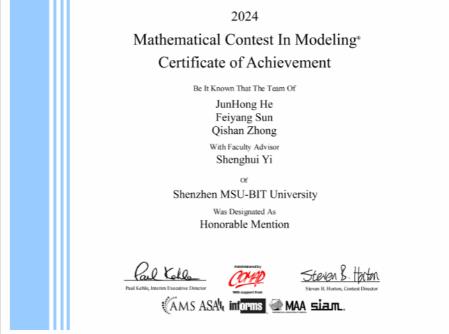 个人简介:何俊宏,中共党员,工程系电子与计算机工程专业2022级本科生。多次获校级学业一等奖学金,获评深圳北理莫斯科大学“优秀学生标兵”“优秀共青团员”“科技创新先进个人”等称号;荣获全国大学生数学建模比赛广东省一等奖、美国大学生数学建模比赛H奖(Honorable Mention)等荣誉。