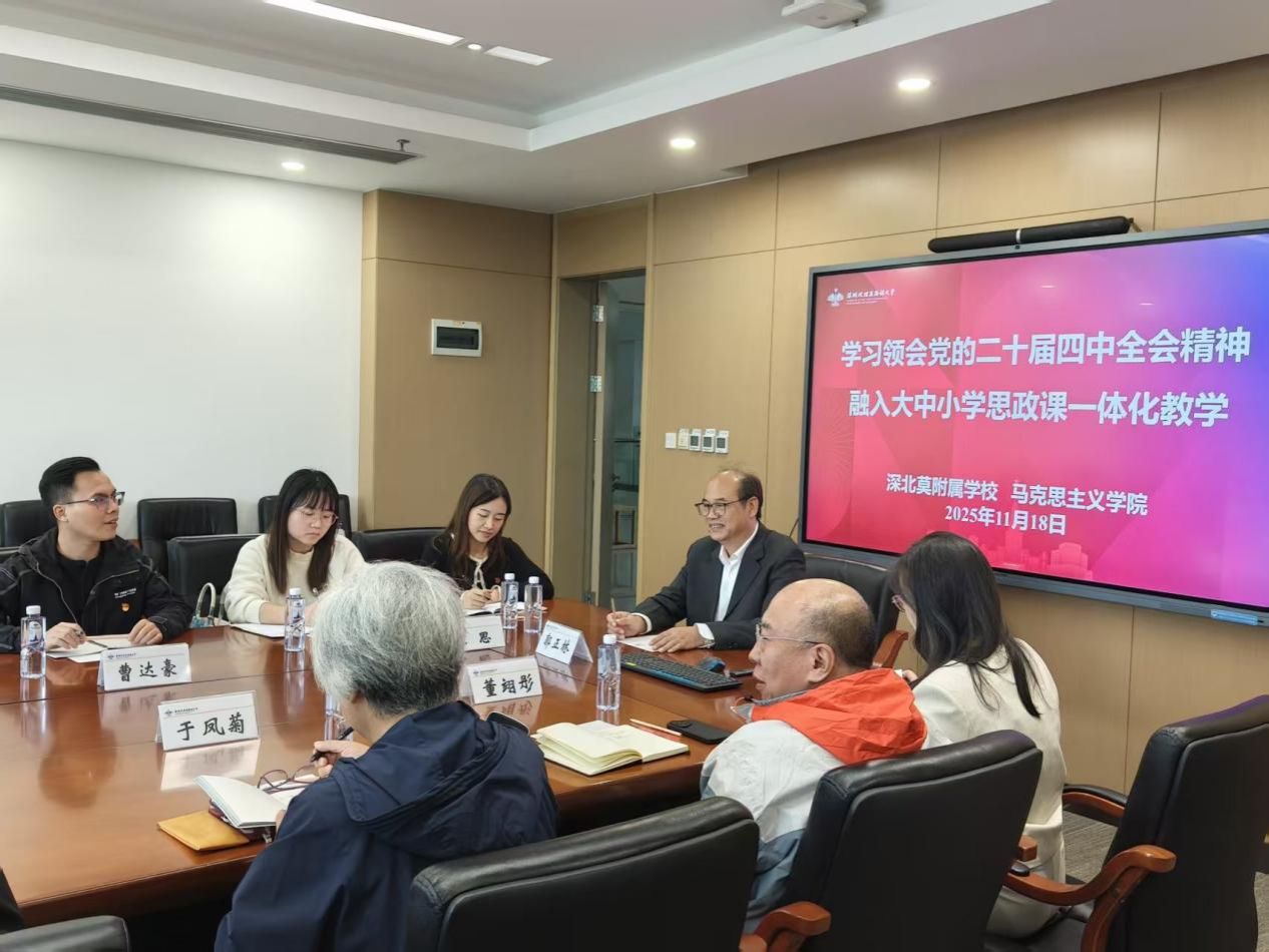 为把党的二十届四中全会精神,迅速融入大中小学思政课教学,2025年11月18日,深圳北理莫斯科大学马克思主义学院和基础教育集团思政课教师举办集体备课会。集体备课会由马克思主义学院刘世华教授主持,深北莫各学段老师集中学习、集体备课,把贯彻落实四中全会精神变成实际行动。