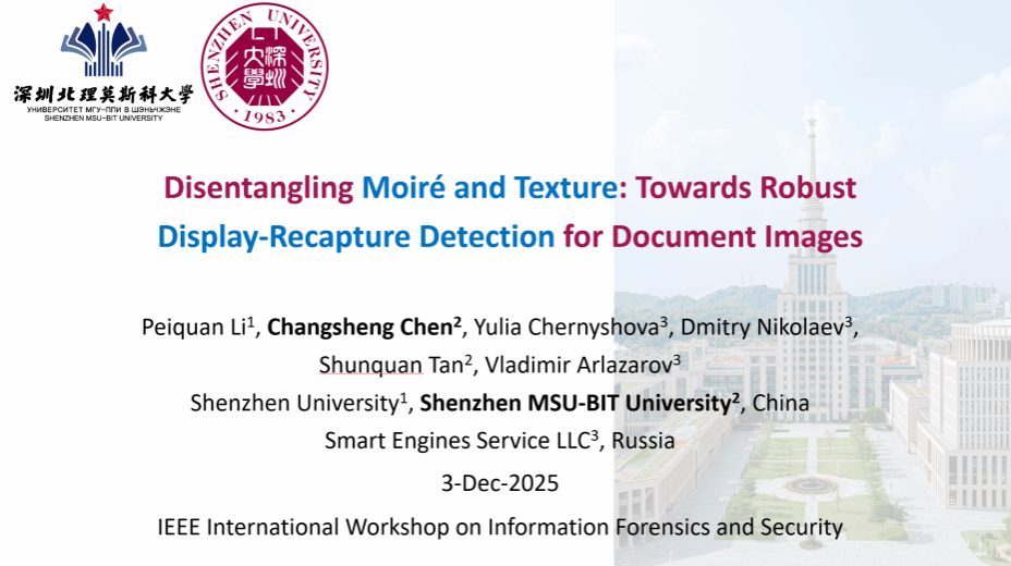 论文信息:P. Li, C. Chen, Y. Chernyshova, D. Nikolaev, S. Tan, and V. Arlazarov, “Disentangling Moiré and Texture: Towards Robust Display-Recapture Detection for Document Images,” 17th International Workshop on Information Forensics and Security (WIFS), Perth, Australia, 2025.