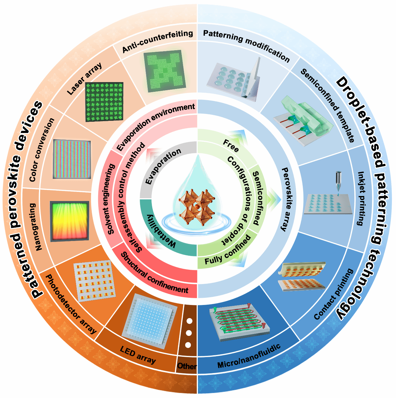 可溶液加工的钙钛矿材料能够借助微液滴技术实现精确的自组装与图案化,该方法已成为构建图案化钙钛矿的首选方案。通过调控液滴的配方、蒸发环境及其尺寸,众多研究者已制备出量子点、纳米线、微米片及多晶薄膜等多种形貌的钙钛矿阵列。伴随器件向柔性化、微型化及阵列化发展,钙钛矿在发光二极管、光电探测器、激光器等领域获得广泛应用。