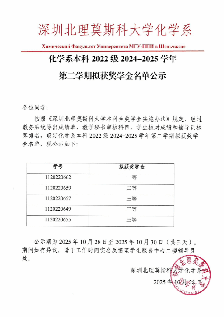 化学系本科2022级2024-2025学年第二学期拟获奖学金名单公示