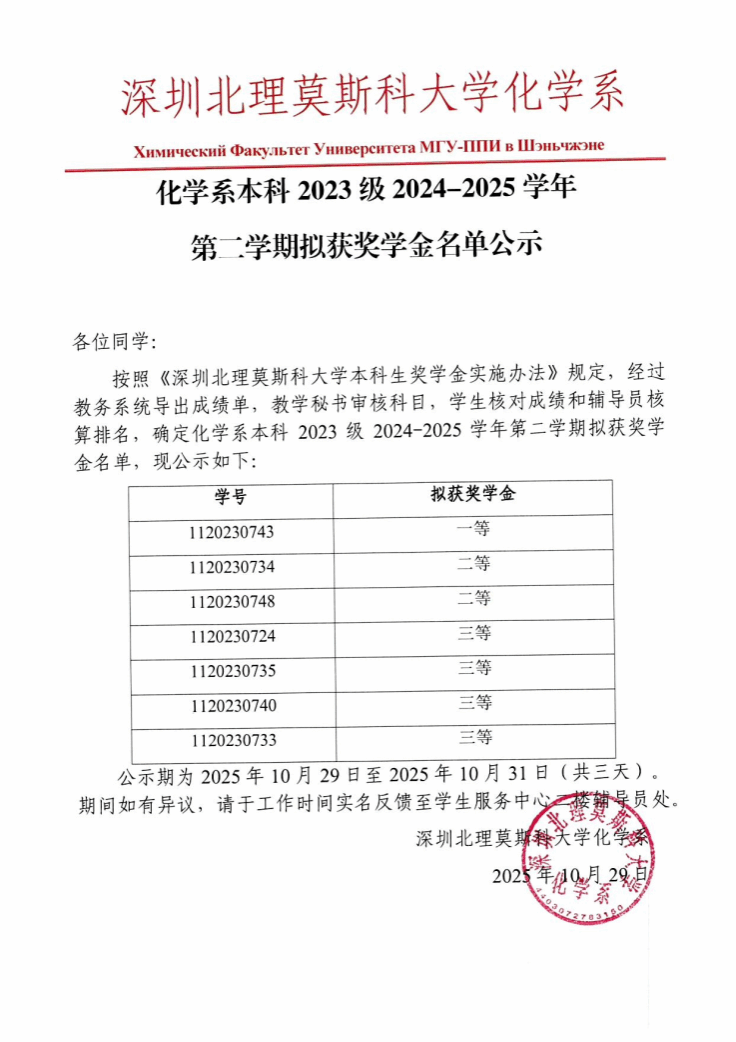 化学系本科2023级2024-2025学年第二学期拟获奖学金名单公示