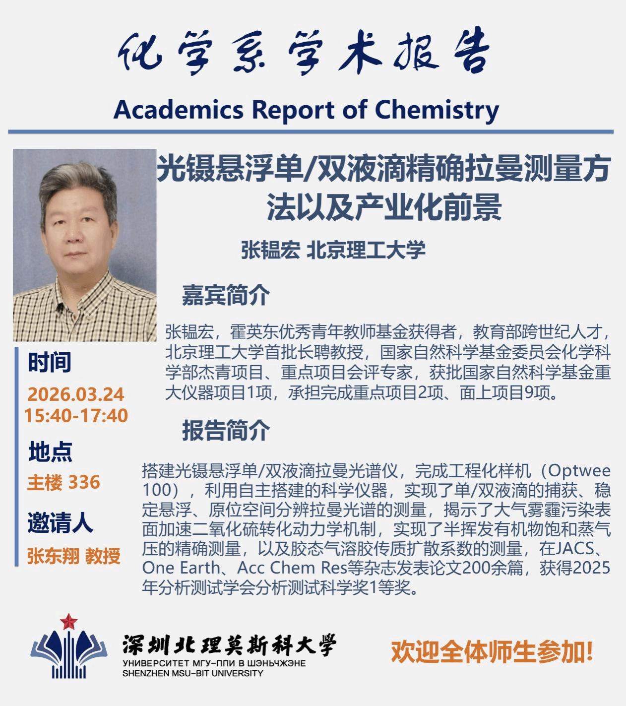 为深化物理化学、分析化学与交叉学科前沿探索,推动高端科研仪器自主创新与成果转化,2026年3月24日下午,应化学系中方系主任张东翔教授邀请,北京理工大学首批长聘教授、国家杰出青年基金会评专家张韫宏教授到访化学系并做题为《光镊悬浮单/双液滴精确拉曼测量方法以及产业化前景》的学术分享。