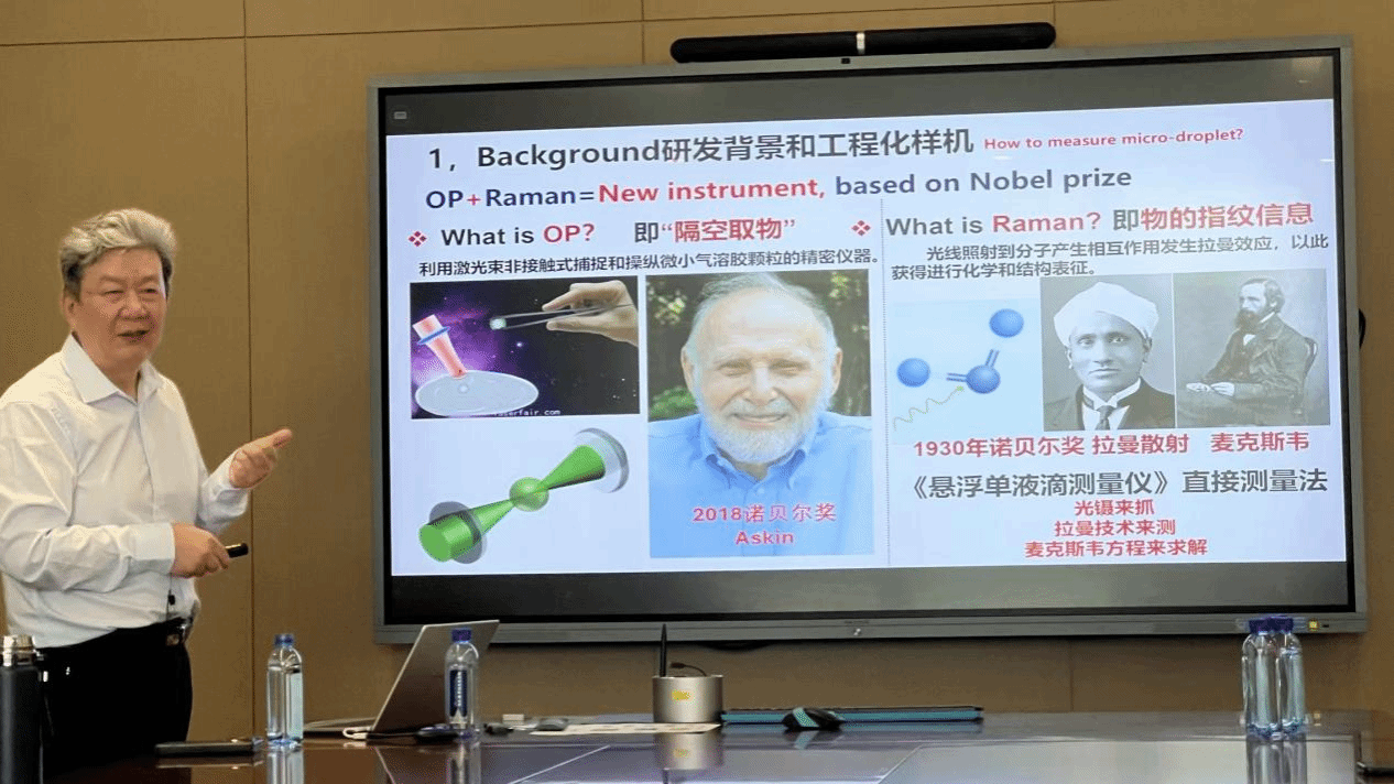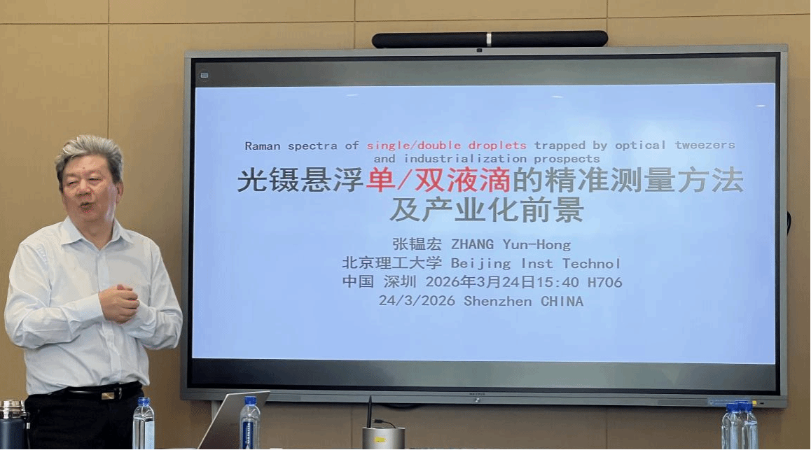 报告中,张韫宏教授围绕光镊拉曼联用技术的科学原理、核心突破、仪器工程化与产业化前景展开系统阐述,将基础科研与产业应用深度融合,为在场师生呈现了前沿交叉学科的创新路径。他指出,团队核心技术融合2018年光镊技术与1930年拉曼散射光谱两项诺贝尔奖成果,结合麦克斯韦方程完成数据求解,自主研发Optwee 100悬浮单液滴测量仪工程化样机,实现对单/双液滴的捕获、稳定悬浮与原位空间分辨拉曼光谱测量,该仪器时间分辨率优于0.5毫秒、空间分辨率优于500纳米、粒径检测范围1.4–14微米,指标全面超越国外同类产品,实现高端科学仪器自主可控。依托自主研发的仪器,团队取得一系列原创性科研成果,不仅揭示了雾霾表面加速二氧化硫转化为硫酸盐的动力学机制,为大气污染协同治理提供核心科学支撑,还发现二氧化碳可在液滴表面自发生成还原剂与催化剂,在温和条件下直接转化为甲酸,为温室气体资源化利用开辟新路径,同时实现亚微米尺度液滴组分空间分辨测量,可应用于癌细胞胶态结构检测、药物作用监测等生物医学领域,还精准测定了半挥发有机物饱和蒸气压、胶态气溶胶传质扩散系数,为化工过程强化、胶体化学研究提供关键数据。