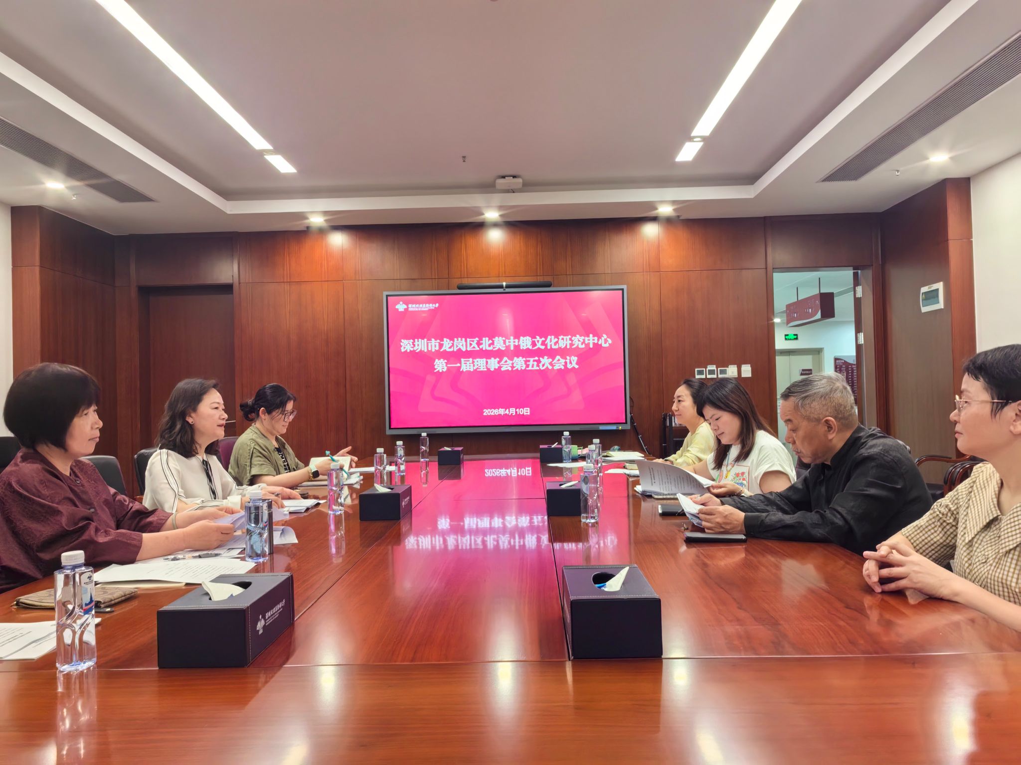2026年4月10日上午,深圳市龙岗区北莫中俄文化研究中心第一届理事会第五次会议在主楼623会议室召开。会议由理事长万美娜主持,6位理事、1名监事及相关工作人员参会。会议审议了理事长所做的2025年度述职报告和2026年度总结计划;商议了财务人员所做的2026年度财务预算报告、分部门实施项目的办法以及完善内部管理制度等事项;就白名单赛事的筹备与承办、捐赠协议、专职工作人员聘用等相关事项进行了深入讨论。