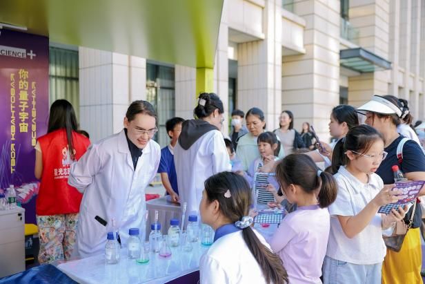 中心广场的互动区里,一个装有淡粉色浓稠液体的容器吸引了众多市民驻足,大家里三层外三层围得水泄不通。“这是什么?摸起来好软!不对,怎么又变硬了?”在志愿者的指引下,成年人与小朋友纷纷伸手一探究竟。“这是‘非牛顿流体’,它的特性是‘你越用力触碰,它就越坚硬’。” 志愿者耐心向体验者解释这一物质的科学原理。